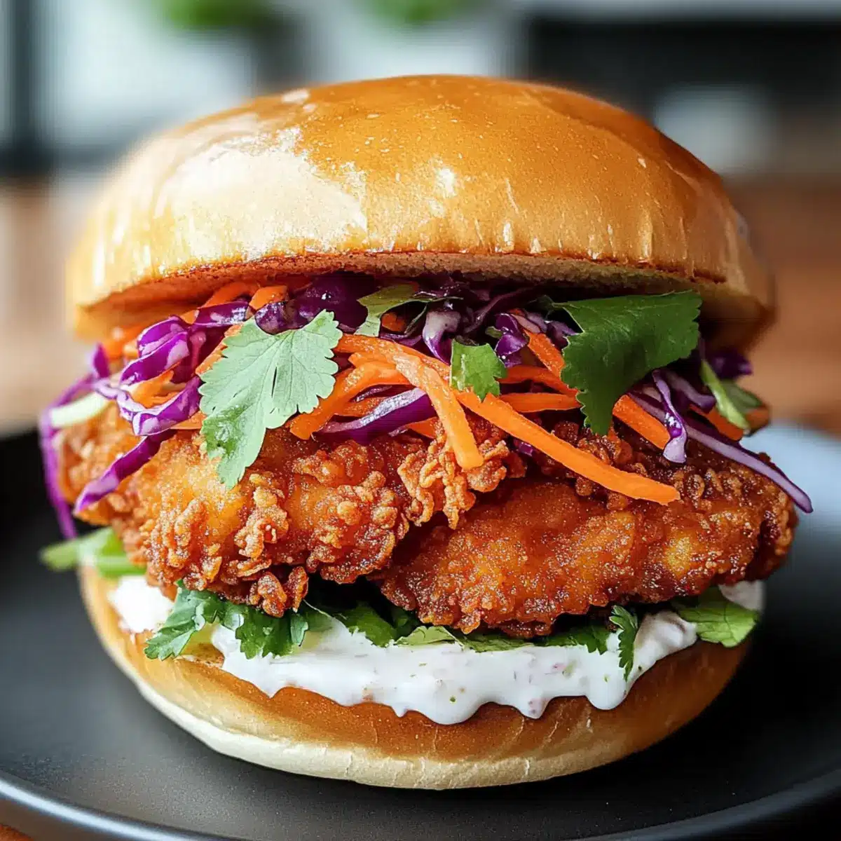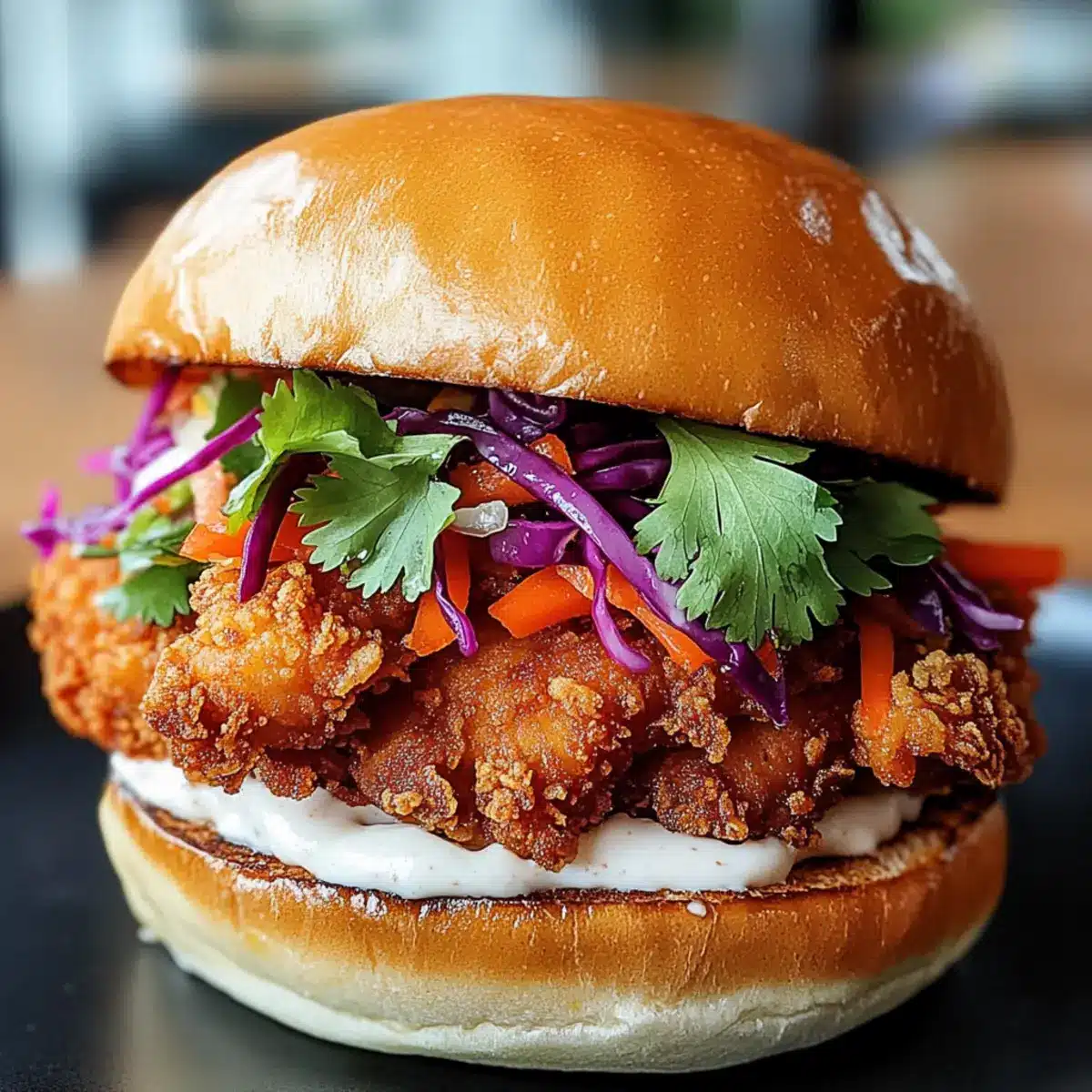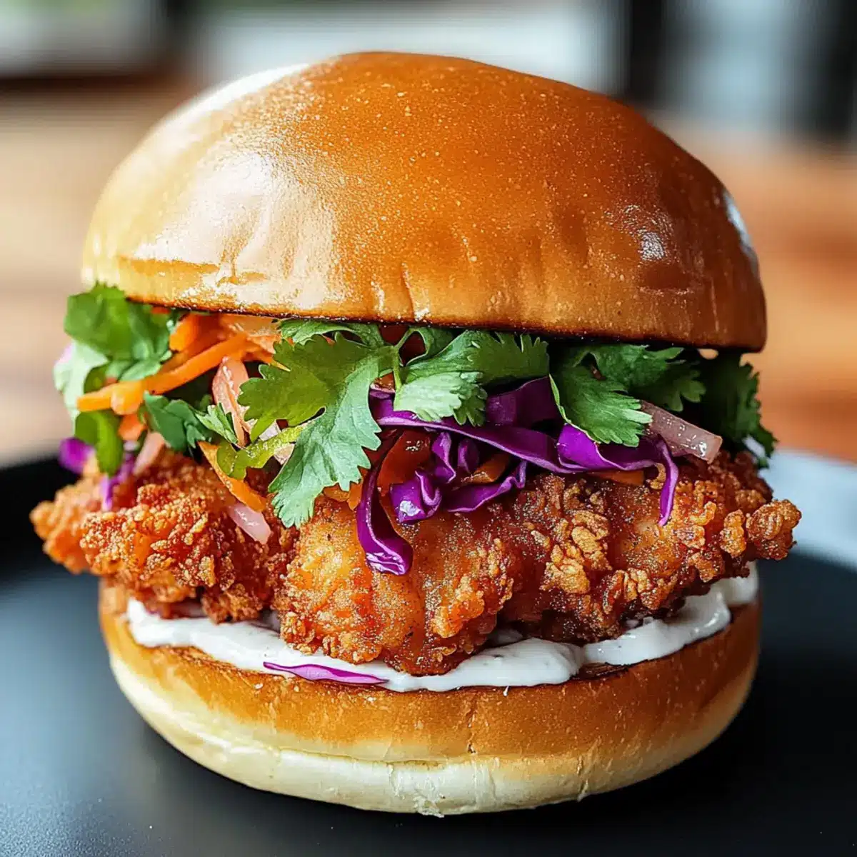 - Assemble the sandwich with spicy mayo, fried chicken, cabbage, pickled carrots, and cilantro.