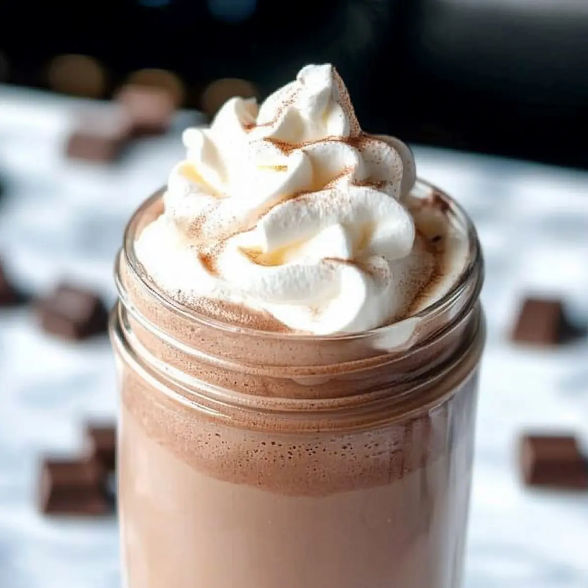 Frozen Delight: Turn this recipe into a cool treat by blending all ingredients with ice for a whipped hot chocolate shake! Serve it in a tall glass with a candy cane for a fun, festive touch.